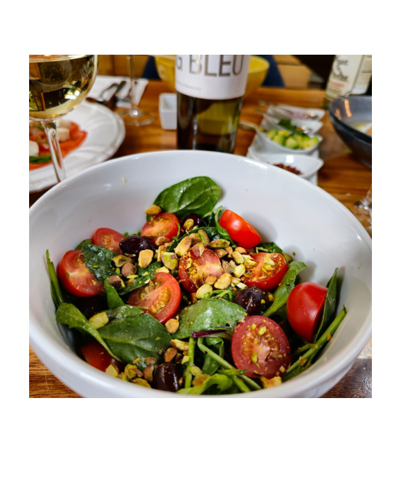 Omelette de claras, relleno de espinaca, ejotes, pimientos y queso de cabra.