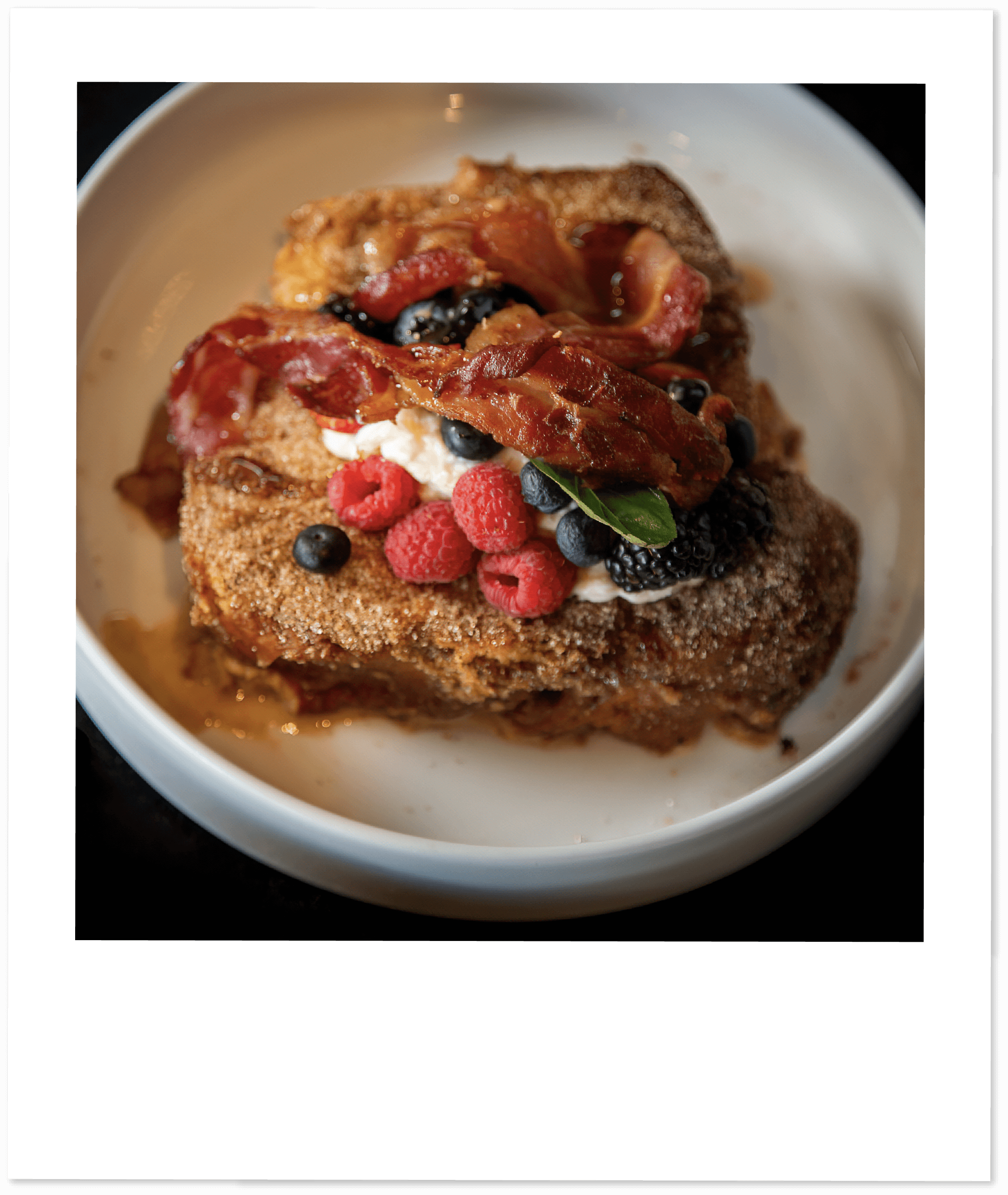 Pan brioche rebosado y sellado a la plancha. Se sirve con tocino, frutos rojos, miel maple y queso crema.